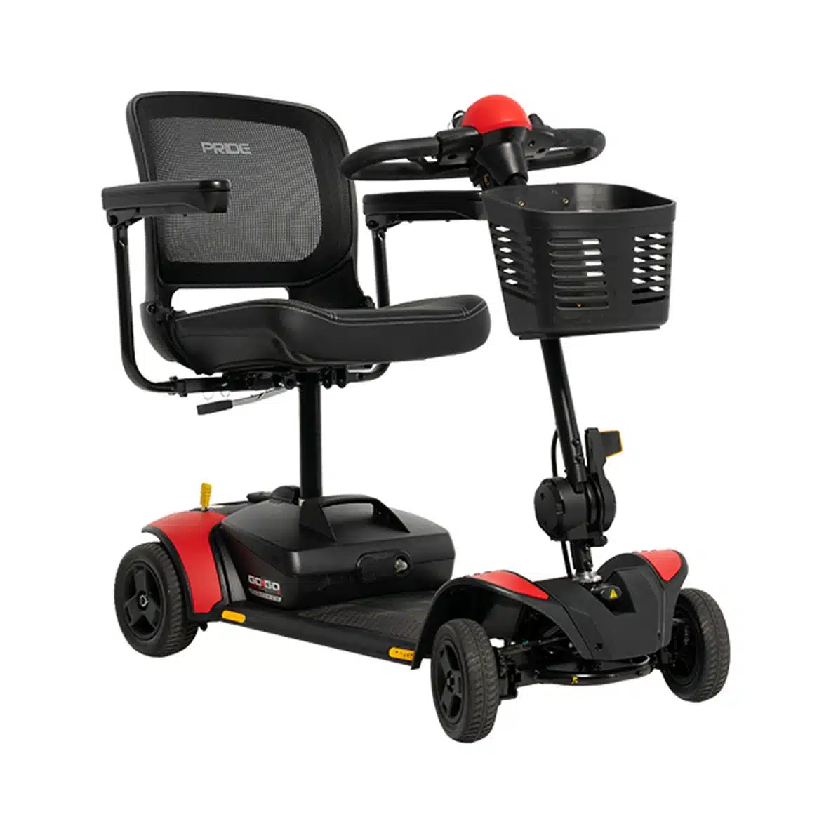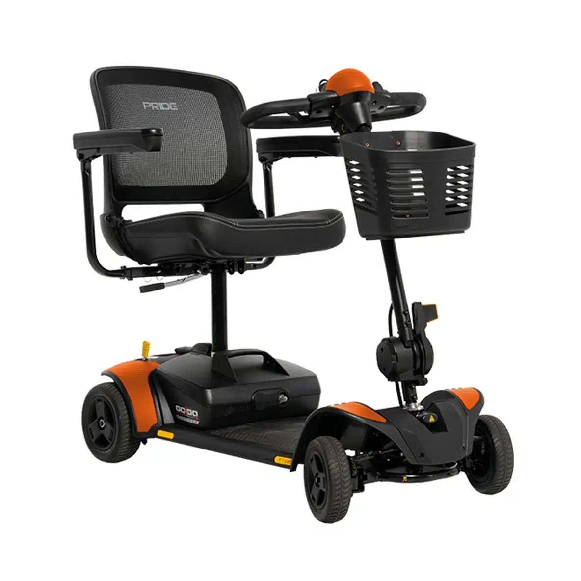 An advanced tiller mechanism allows you to adjust the angle of your tiller with your hand or foot. And like all Go Go units, the scooter easily separates into five lightweight pieces thanks to feather-touch disassembly.